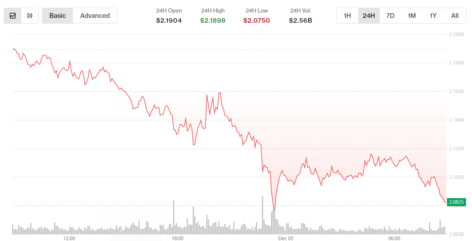 2.05ドルからのきれいな反発と2.11ドルの奪還があれば、買い手が勢いを取り戻している最初のサインとなるだろう。失敗すれば、11月の安値を露呈させ、弱気サイクルが12月まで続くことになる。
